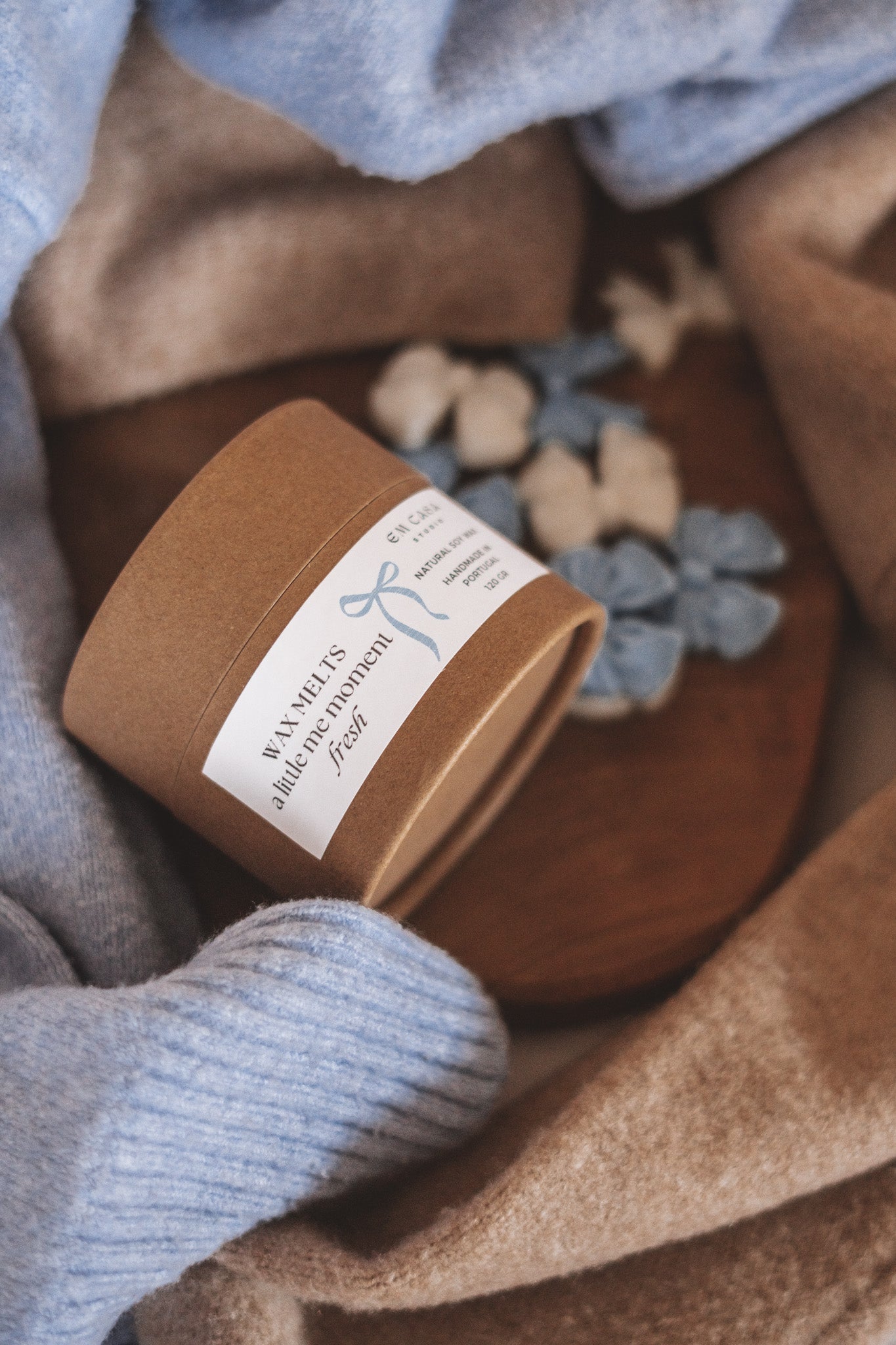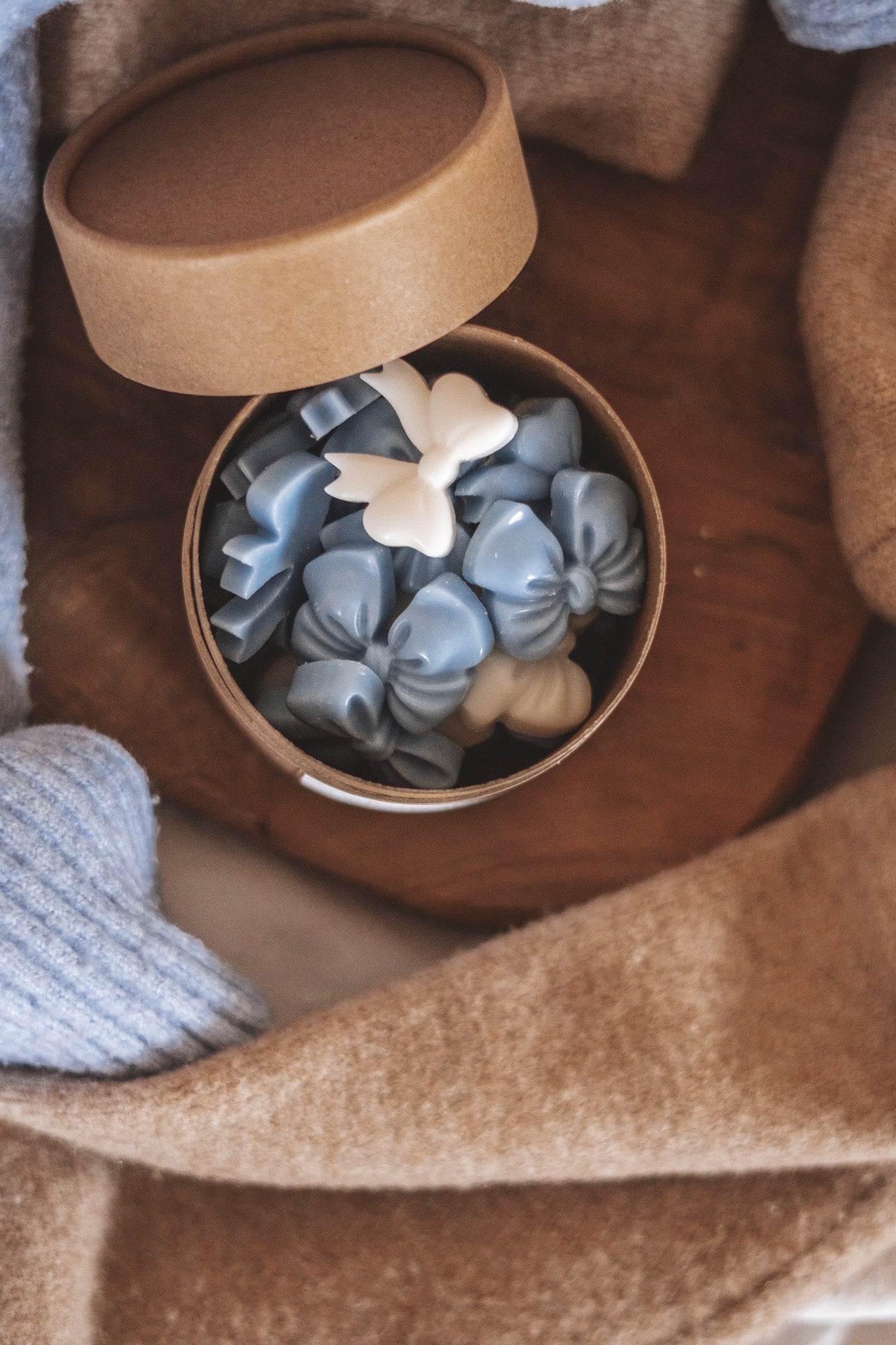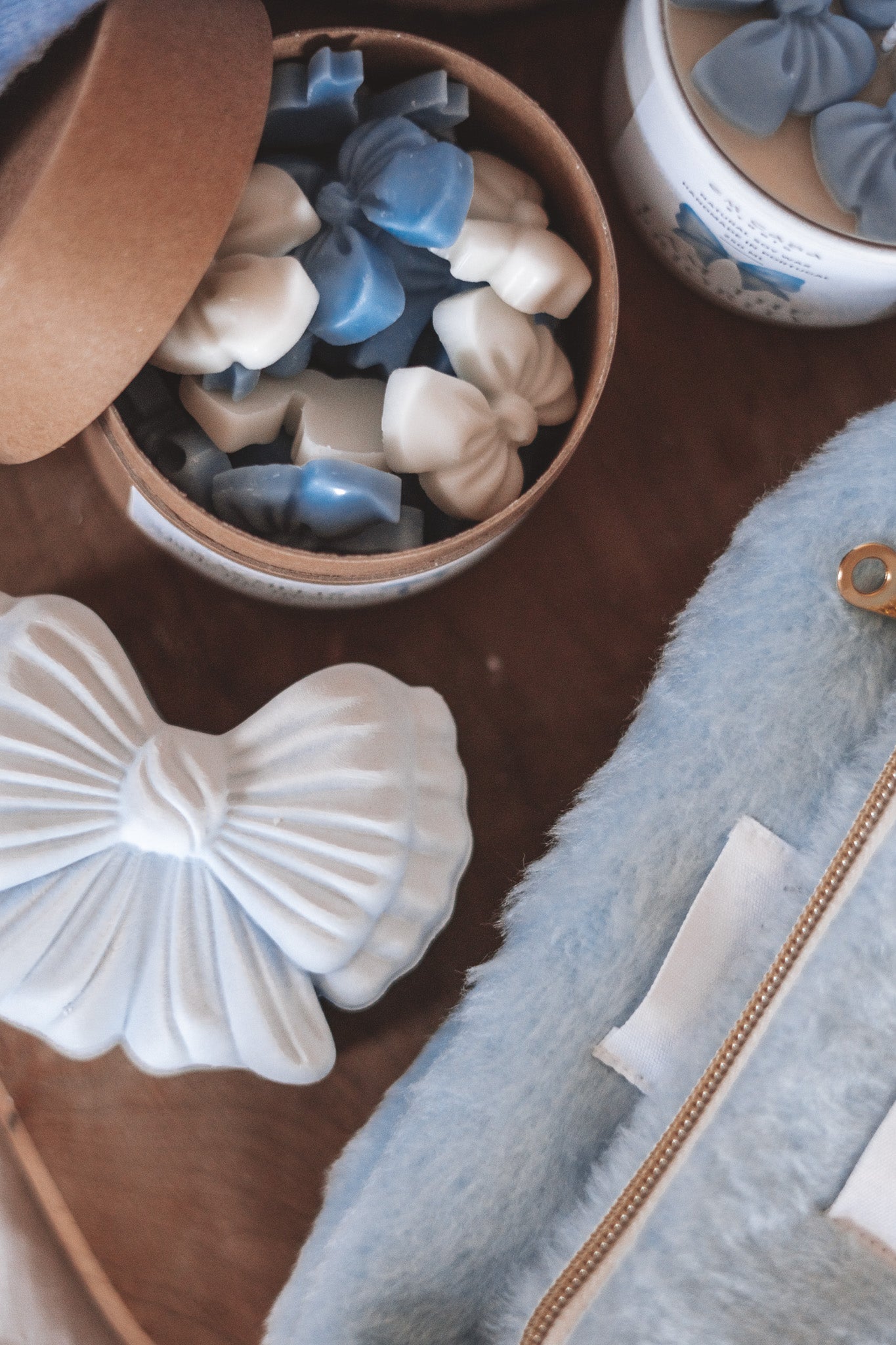 The blue and white bows remind you that self-care can be simple, light, and part of your daily routine.