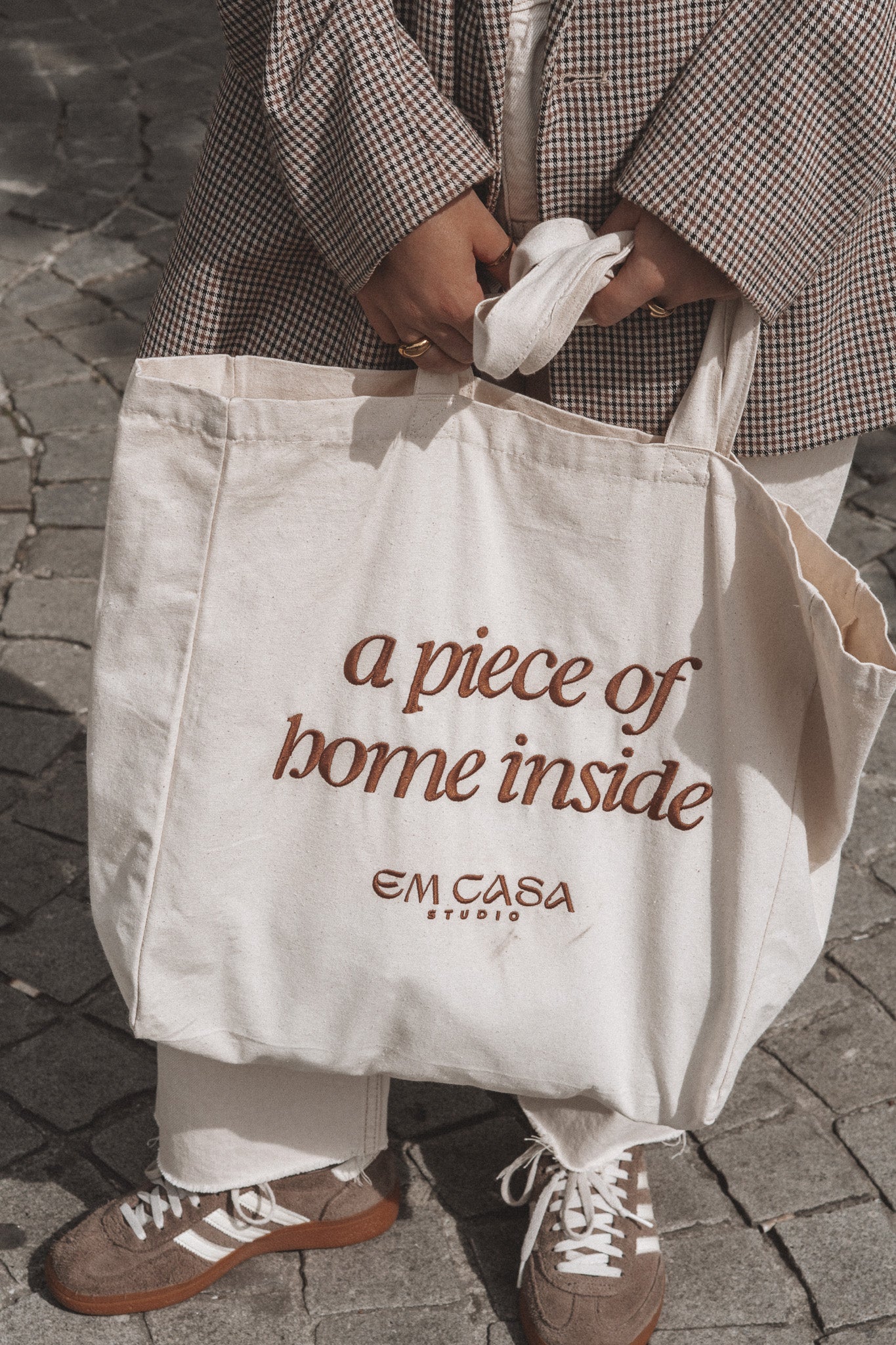 “A Piece of Home Inside” is more than just a tote bag — it’s a daily reminder that home isn’t just a place, it’s a feeling. Designed to hold your little rituals on the go, this tote is perfect for carrying your essentials: a book that inspires you, a comforting snack, flowers picked along the way, or that Em Casa candle that makes you feel grounded, even when you’re far from home.