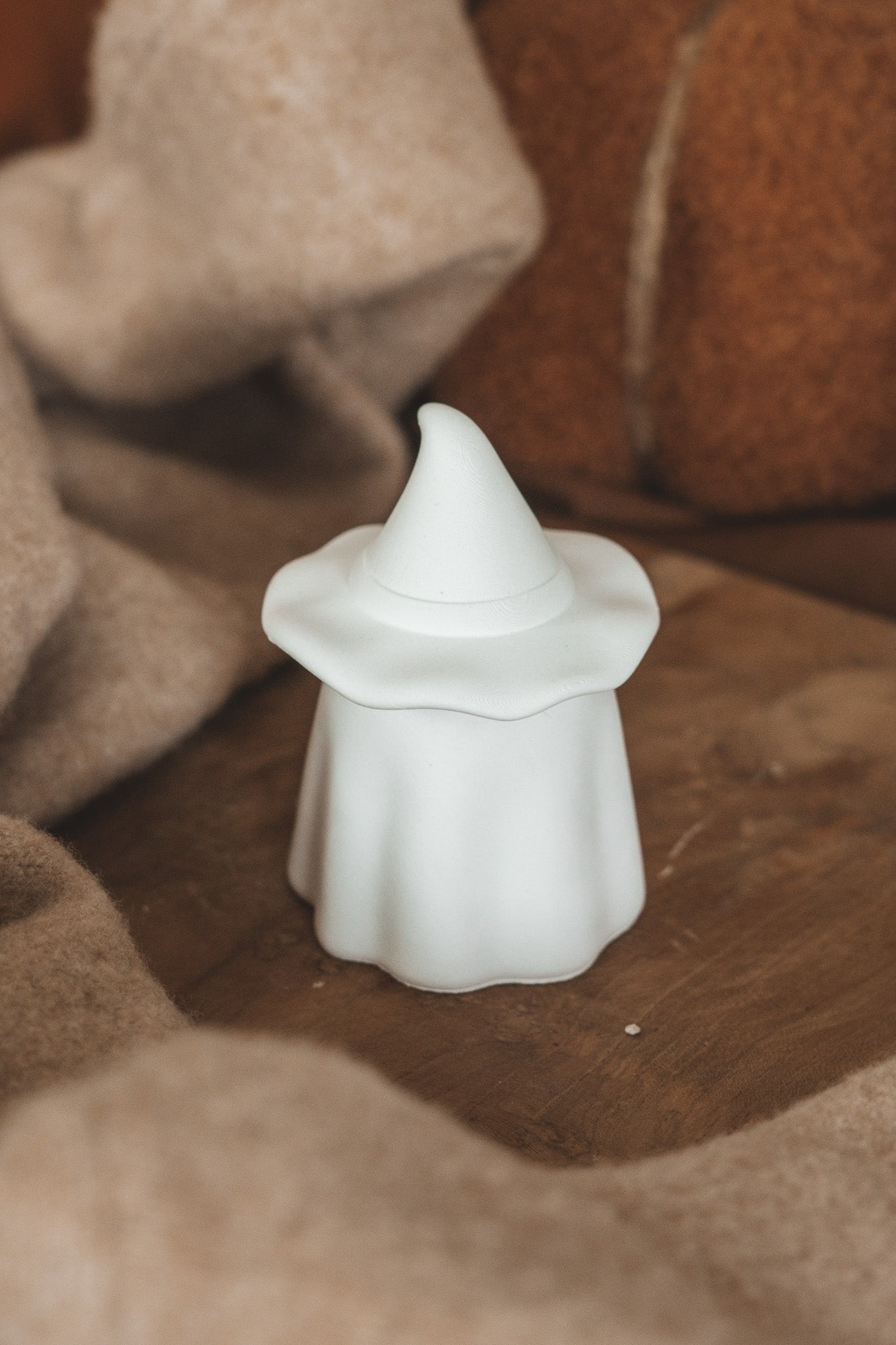O Pequeno Fantasma é uma peça de cerâmica encantadora para o Halloween. Fofo, divertido e cheio de personalidade, traz um toque de magia a qualquer cantinho—perfeito para dares à tua casa aquele espírito acolhedor e festivo da estação.