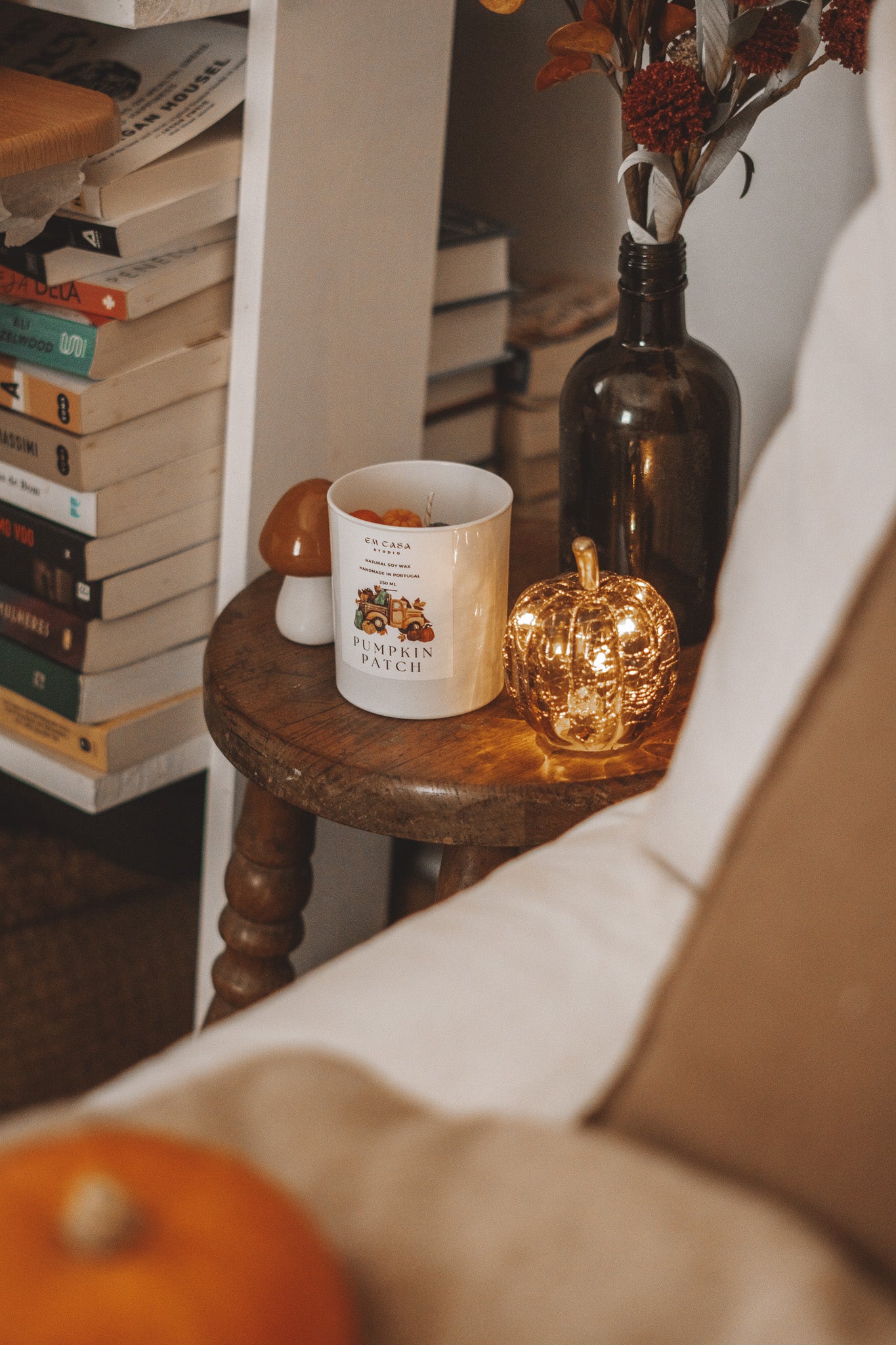 A Pumpkin Patch é o outono, vertido à mão e cheio de magia. Com o aroma doce e especiado de abóbora e decorada com as abóboras mais queridas no topo, faz-te sentir como se trouxesses um dia de colheita acolhedor para dentro de casa. Criada com carinho pela Em Casa Studio.