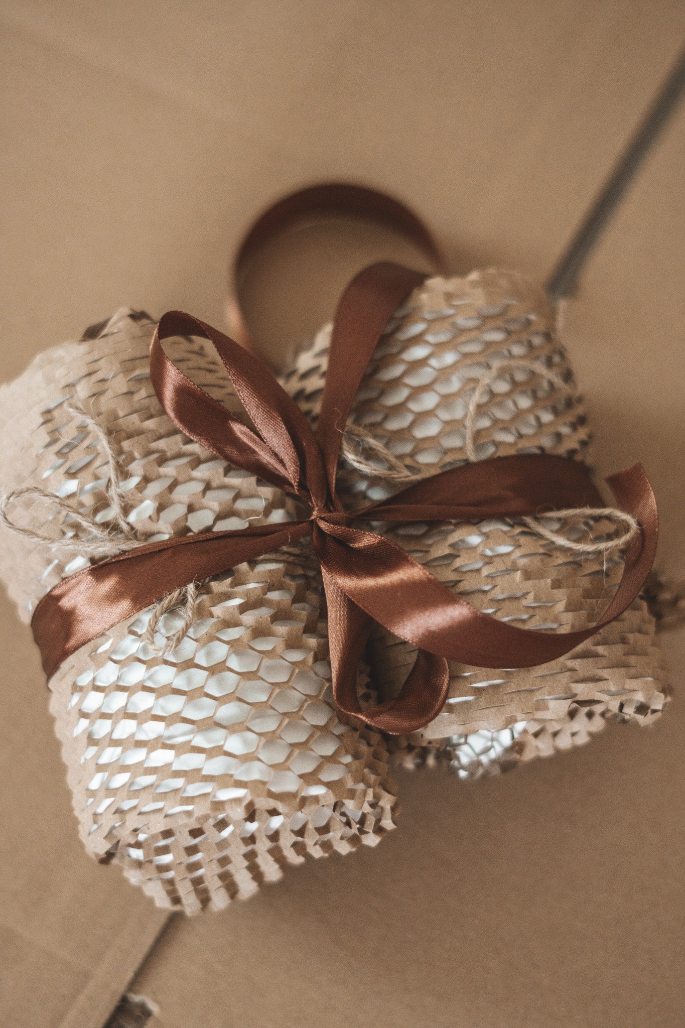 A opção de oferta das velas inclui uma caixa kraft com uma etiqueta branca, papel de seda branco, cartão karft e um lanço em fio de juta.